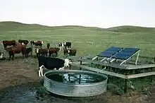 Também se emprega a fotovoltaica para alimentar instalações de bombagem para sistemas de irrigação, água potável em áreas rurais e bebedoiros para o gado, ou para sistemas de dessalinização de água.[81][82][55]