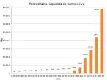 Também a instalação de energia fotovoltaica se desenvolveu espectacularmente no país asiático em anos recentes, superando inclusive as previsões iniciais. Em 2011, a Assembleia Popular Nacional da China estabeleceu em 5 GW o objectivo mínimo oficial para 2015, fixando o objectivo em longo prazo em 20–30 GW para 2020.[5] No final de 2011 a China dobrou a sua potência fotovoltaica instalada com respeito ao ano anterior, até atingir os 3 GW. Assim mesmo, a tarifa de injecção baixou até 0,80 yuans por kWh, o que significou chegar ao mesmo nível das tarifas aplicáveis às termoelétricas de carvão.[6]