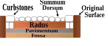 Acima do rudens vinha a summa crusta, lajes poligonais de 30 centímetros a um metro de diâmetro, vinte a 30 centímetros de espessura. A superfície final era feita de concreto ou sílex polido.