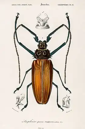 | Enoplocerus armillatus (Linnaeus, 1767)[1][3][2] ![]() Ilustração de E. armillatus e de algumas de suas estruturas corporais; retirada do livro Dictionnaire Universel D'histoire Naturelle, por Charles Dessalines d'Orbigny (1849) - Coléoptères. PL. 11.[4] | |||||||||||||||||||||
