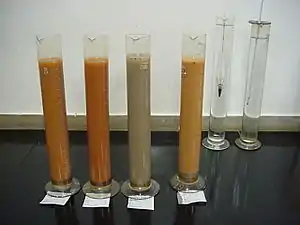 Amostras de solos dispersas em água destilada e colocadas em repouso para sedimentar em provetas com capacidade para 1.000 ml.