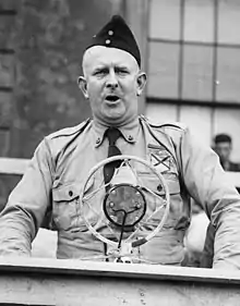 Seus colegas do Fine Gael, que se consideravam defensores da lei e da ordem, ficaram constrangidos com o uso de violência e ataques aos Gardaí pelos Camisas Azuis, além das conexões de O'Duffy com organizações fascistas estrangeiras e sua visão do IRA como comunista. grupo. [69] O prestígio de O'Duffy foi prejudicado quando Fine Gael só ganhou a maioria em seis conselhos contra os quinze de Fianna Fáil nas eleições locais irlandesas de 1934, depois que O'Duffy previu que levaria vinte. [70] O custo do ativismo do Blueshirt também começou a prejudicar financeiramente o partido. [71] A aprovação de O'Duffy da agitação ilegal contra a cobrança de anuidades de terra pelo governo, a declaração de seu apoio a uma república e a revelação de suas conexões com a União Britânica de Fascistas e o Fedrelandslaget foram a gota d'água para os moderados em Fine Gael. Em 5 e 7 de setembro de 1934, Cosgrave, Ned Cronin e James Dillon conheceram O'Duffy, resultando em um acordo de que O'Duffy poderia "entregar apenas discursos cuidadosamente preparados e concisos de manuscritos" e dar entrevistas "somente após consulta e por escrito". Em resposta, O'Duffy renunciou ao partido em 18 de setembro. [72]