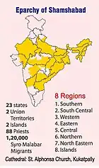 A eparquia estende a sua jurisdição a todos os fiéis siro-malabares da Índia, não incluídos nas eparquias existentes no momento da ereção da nova circunscrição eclesiástica, incluindo os arquipélagos Laquedivas e Andamão e Nicobar. A sede eparquial é a cidade de Shamshabad, no estado de Telangana. A Igreja de Santa Afonsa em Kukatpally, perto de Hyderabad, serve como pró-catedral da eparquia.[2]