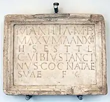 MANILIA M(arci) F(ilia) / MAXUMA AN(anorum) XII (duodecim) / H(ic) S(ita) E(st) S(it) T(ibi) T(erra) L(evis) /