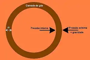 O fluido está submetido à força gerada pelo seu próprio campo gravitacional. Esta força é radial e aponta para o centro da estrutura. A magnitude da força gravitacional é denotada pela letra g é considerada uma função da distância ao centro r: