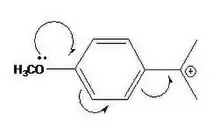 Para melhor explicar o que foi supracitado, segue a tabela com os valores de σp+ na estabilização do carbocátion terciário gerado pela solvólise de cloretos de t-cumila para substituídos e os valores de σp- parafenóxidos substituídos, bem como os valores de σp obtidos pela relação de Hammett e o incremento na estabilização para cada substituinte (ΔσR+ e ΔσR-):