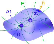 De acordo com o (puramente matemático) teorema de divergência de Gauss, o fluxo elétrico através da superfície de contorno ∂Ω pode ser reescrito como:
