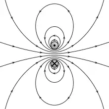 A lei de Gauss, assim chamada em homenagem ao matemático e físico alemão Carl Friedrich Gauss, descreve a relação entre um campo elétrico e as cargas elétricas geradoras do campo.[3] Na descrição em termos de linhas de campo, as linhas de campo elétrico começam das cargas positivas e terminam nas cargas negativas. "Contando" o número de linhas de campo em uma superfície fechada, portanto, obtém-se o total de cargas inclusas naquela superfície. Mais tecnicamente, a lei de Gauss relaciona o fluxo elétrico através de qualquer superfície gaussiana fechada com a densidade de cargas elétricas contidas no interior do volume encerrado pela superfície gaussiana.[4]