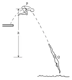 Uma abordagem simples para analisar a trajetória do saltador na figura consiste em admitir que se trata de um único corpo rígido com momento de inércia variável. Como tal, o movimento do saltador terá 3 graus de liberdade: duas coordenadas e para localizar a posição do centro de massa em cada instante, e o ângulo de rotação . Um estudo mais completo poderia ser feito introduzindo mais graus de liberdade para definir a posição do corpo do saltador em cada instante.[1]