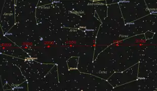 - Os limites da constelação foram definidos em 1930 ao longo das linhas de ascensão reta e declinação para a época B1875.0.