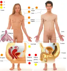 Essas áreas produzem sensações mais fortes e incluem as genitálias, incluindo o prepúcio, clitóris, vulva e pele perianal, escroto, lábios, boca e mamilos. A rete, a inervação do epitélio, é melhor formada e com mais nervos, que estão mais perto da superfície externa da pele do que em regiões que há pelos.[8][9]