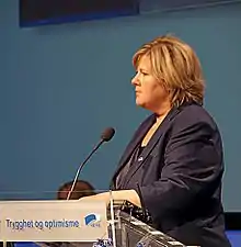 Erna Solberg (Bergen, 24 de fevereiro de 1961) é uma política, socióloga, politóloga, estadista e economista norueguesa. É filiada ao Partido Conservador, tendo começado sua carreira política em 1979 no governo local de sua cidade natal. Em 1989 foi eleita deputada do Storting, tendo permanecido até ao momento atual. Em 2001 passou a fazer parte do governo do primeiro-ministro Kjell Magne Bondevik, nomeada ministra do Governo Local e Desenvolvimento Regional até o ano de 2005. Desde 2004, é a presidente do Partido Conservador.