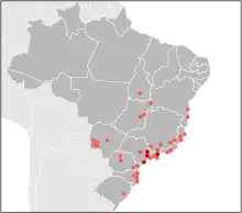 | Mapa de distribuição da Erythrina speciosa, com foco no território brasileiro | |