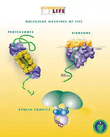 As máquinas moleculares em nanoescala mais complexas são proteínas encontradas dentro das células, geralmente na forma de complexos multiproteicos.[5] Algumas máquinas biológicas são proteínas motoras, como a miosina, que é responsável pela contração muscular; a cinesina, que move a carga dentro das células para longe do núcleo ao longo dos microtúbulos, e a dineína, que move a carga dentro das células em direção ao núcleo e produz o batimento axonemal de cílios móveis e flagelos. "Na verdade, [o cílio móvel] é uma nanomáquina composta de talvez mais de seiscentas proteínas em complexos moleculares, muitos dos quais também funcionam independentemente como nanomáquinas".[6] "Ligantes flexíveis permitem que os domínios proteicos móveis conectados por eles para recrutar os seus parceiros de ligação e induzir uma alosteria de longo alcance via dinâmica de domínio de proteína".[6] Outras máquinas biológicas são responsáveis pela produção de energia, por exemplo ATP sintase, que aproveita a energia de gradientes de prótons através das membranas para conduzir um movimento semelhante a uma turbina usado para sintetizar ATP, a moeda de energia de uma célula.[7] Ainda outras máquinas são responsáveis pela expressão gênica, incluindo ADN polimerases para replicar DNA, ARN-polimerases para produzir mRNA, o spliceossomo para remover íntrons e o ribossomo para sintetizar proteínas. Essas máquinas e sua dinâmica em nanoescala são muito mais complexas do que qualquer máquina molecular que já tenha sido construída artificialmente.[8]
