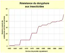 Devido ao uso intensivo de inseticidas na cultura da batateira e a propensão da espécie em se adaptar a substâncias tóxicas, muitas populações de escaravelhos tornaram-se resistentes aos inseticidas, principalmente a partir da década de 1980. Mesmo que nem todas as populações estejam envolvidas, e se a resistência muitas vezes diz respeito apenas a certos tipos de inseticidas, o escaravelho-da-batata tinha desenvolvido (até 2008) resistência a 52 substâncias ativas pertencentes todas as principais famílias de inseticidas. No caso do oxamil, os casos de resistência já foram mesmo registados desde o primeiro ano de uso. Entre as substâncias envolvidas estão, entre outros, carbamatos, organofosforados, organoclorados (incluindo o famoso DDT ), piretróides e neonicotinóides, além de endotoxinas Bt. O nordeste dos Estados Unidos é a principal região afetada, mas casos também foram observados no restante do país, assim como no Canadá, Europa e Ásia,[11][44]