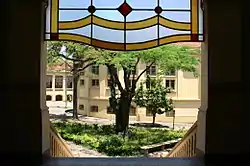 - Térreo, com acesso por uma escadaria de granito de 6 metros de largura, contando com o hall, diretoria, secretaria, biblioteca, anfiteatro e salas de aula repartidas em alas feminina e masculina;