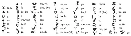 A tradicional ordem mnemónica alfabética pode em parte refletir as origens dos nomes de certas letras. Como exemplo temos: tu e fo (dois, quatro), yu e mi (tu, eu), ko e go (vir, ir) que geralmente vêm juntas. Outras sílabas são colocadas juntas para formar palavras (futu "pé", odi "olá, alô", ati "heart- coração") ou mesmo frases: a moke un taki "isso nos dá fala", masa gado te baka ben ye "Lord God (senhor Deus), o homem branco ouviu" (talvez más traduções).