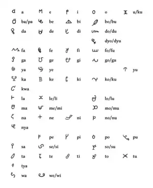 As origens de muitas das letras são desconhecidas, embora alguns seus nomes parecem ser rébus acrofônicos, tendo vindo muitos dos símbolos da África. Exemplos incluem rébus com uma figura de uma curva com um ponto dentro representando um baby em belly (barriga - em Ndyuka, a abi beli, literalmente "ele tem barriga", significado "ela está grávida") e aquele usado para [be]; duas mãos de apertando para give (dar) usada para [gi]; símbolos para come (vir - Ndyuka kom)e para go (ir) representando [ko] e [go]; dois círculos interligados para we(nós) usados para [wi], enquanto que [yu] (você, tu) é uma inversão da imagem de [mi] (eu), correspondiendo aos pronomess pessoais.letras como os [[numeração romana]|números romanos]] two e four (2 e 4) são [tu] e [fo]. [ka] e [pi] representam fezes (Ndyuka kaka) e urina (pisi). Um sinal "+" é usado para [ne],oriunda da palavra name, derivada da prática de marcar o nome de alguem com um X. O estranho uso misturado de [u] e [ku] se deve à essa letra ser um par de ganchos, que é uku em Ndyuka.[nota 1] As únicas letras que correspondem em forma ao alfabeto latino são as vogais a, o, talvez e, enquanto que o se justifica por ser o formato da letra ao ser pronunciada.[nota 2]