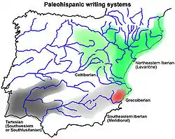 Com exceção da escrita Greco-Ibérica e numa menos escala esta do sudoeste, as demais escritas paleohispânicas compartilhavam uma tipologia própria. Funcionavam como silabários para consoantes oclusivas e como alfabetos para as demais consoantes e vogais. Essa forma incomum de escrita era chamada de Semi-silabário. Não há um consenso acerca de como se originaram esses semi-silabários paleohispânicos. Alguns estudiosos relacionam os mesmos ao alfabeto fenício, outros veem uma possível origem no alfabeto grego. Nessa escrita do sudoeste, mesmo que a letra usada para escrever uma consoante oclusiva fosse determinada pela vogal que se segue, como num puro semi-silabário, a vogal seguinte vinha sempre escrita como num alfabeto completo. Alguns estudiosos tratam o Tartessiano como um semi-silabário redundante, outros como um alfabeto redundante.
