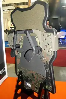 Os escudos balísticos são semelhantes às placas de blindagem corporal em sua construção e são normalmente feitos de compostos plásticos reforçados com fibra, derivados de polietileno de altíssimo peso molecular ou aramida.[2] Eles podem, como blindagem de cerâmica, incorporar uma camada de cerâmica em sua superfície externa para permitir-lhes derrotar balas perfurantes com núcleo de aço. Eles podem ter recursos como vidros à prova de balas, alças ambidestras e holofotes para uso noturno, e podem ser portáteis ou montados em estruturas com rodas. Eles variam em tamanho, sendo alguns projetados para proteger apenas a parte superior do tronco e outros projetados para proteger todo o corpo.[3] Ao contrário de um colete balístico, os projéteis parados com sucesso por um escudo balístico não transferem trauma ou dor ao portador, pois são projetados para não entrarem em contato direto com o corpo.[1]