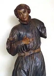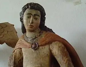 - "Existia um retábulo maior com seis imagens, além de uma de Nossa Senhora e um São Miguel dourados; sobre o tabernáculo, uma pintura de Nossa Senhora, duas mesinhas com imagens de São Miguel, Santo Inácio, São Rafael, São Gabriel e Santo Antônio. Ao lado do evangelho, estavam dois retábulos dourados e, em outro, também Santo Inácio dourado, São Miguel e São Roque. Em outro altar mediano, duas imagens de Nossa Senhora e uma de Santa Bárbara, todas douradas; num altar pequeno, a imagem de Santo Isidro, dourada".[68]