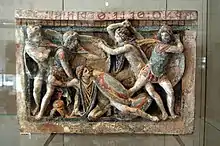 Menelau e Meriones erguendo o corpo de Pátroclo enquanto Odisseu observa, alabastro, Volterra