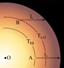 O segundo efeito é o fato de que a temperatura efetiva da atmosfera estelar é, normalmente, decrescente com o aumento da distância para o centro da estrela. A radiação emitida por um gás é uma forte função da temperatura. Para um corpo negro, por exemplo, a intensidade integrada ao longo do espectro é proporcional à quarta potência da temperatura (lei de Stefan-Boltzmann). Quando olhamos para uma estrela, em primeira aproximação, a radiação vem de um ponto em que a profundidade óptica é unitária, e este ponto é mais profundo quando olhamos para o centro, portanto a temperatura será maior, e a intensidade também, do que quando olhamos para o bordo.