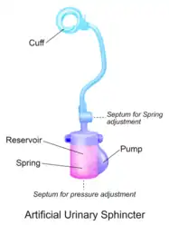 - O esfíncter urinário artificial com mola (2 componentes): manguito de controle e bomba.[3][4] O manguito de controle é colocado ao redor da uretra, e a bomba é inserida dentro do escroto. A pressão do circuito hidráulico é gerada pela mola na bomba. A pressão no espaço retropúbico não influencia esse tipo de esfíncter.