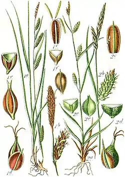 Ilustração de duas espécies de Carex, da obra Deutschlands Flora in Abbildungen (1796): 1. C. binervis; 2. C. punctata