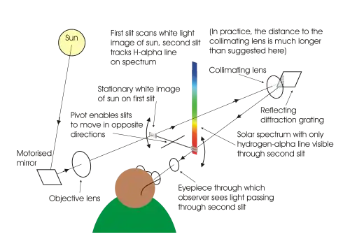 A visão, entretanto, seria de apenas uma faixa estreita da superfície do Sol. As ranhuras são movidas sincronizadamente, para varrer a totalidade da superfície do Sol, fornecendo uma imagem completa. Espelhos que se inclinam independentemente podem ser usados em lugar de ranhuras móveis para produzir a mesma varredura; o primeiro espelho seleciona uma fatia do Sol, e o segundo seleciona o comprimento de onda desejado.