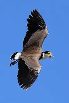 Voo do Vanellus miles. É possível ver esporões na parte da frente das asas.