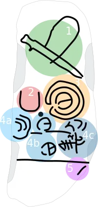 - Nº 5: sulco nas costas, ou seja uma incisão nas costas que represente a coluna vertebral. Também aparece nas estátuas celtas como o guerreiro de Hirschanden.