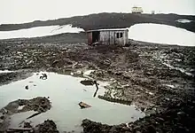 Armazém a céu aberto de materiais com a base Eduardo Frei (Chile) ao fundo.