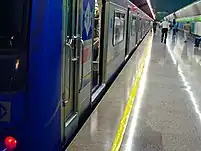 Estação subterrânea composta por mezanino de distribuição e plataformas laterais com estrutura em concreto aparente.[2]