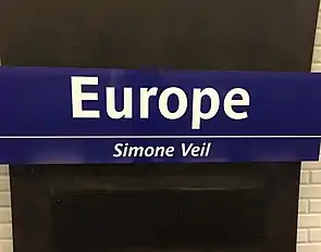 Em 25 de abril de 2018, a presidente da região da Ilha de França Valérie Pécresse, anunciou que a estação de metrô portaria o nome de "Europe - Simone-Veil", do nome da ex-ministra da Saúde e primeira presidente do Parlamento Europeu, morta em 30 de junho de 2017.[4] A inauguração ocorreu em 29 de maio de 2018; o nome de Simone Veil é apresentado em subtítulo nas novas placas, simultaneamente com a sua atribuição na place de l'Europe no mesmo dia em complemento de sua denominação original.[5][6]