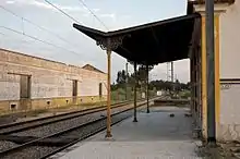 Esta interface apresenta duas vias de circulação, identificadas como I e II, com comprimentos de 518 e 496 m e acessíveis por plataformas de 54 e 40 m de comprimento e com 35 e 30 cm de altura, respetivamente.[3] O edifício de passageiros situa-se do lado sudoeste da via (lado direito do sentido ascendente, para Vendas Novas).[6][7]
