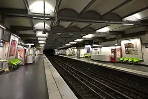 Dos anos 1950 a 2009, os pés-direitos eram revestidas de cambagem metálica com montantes horizontais vermelhos (para os de cima) e cinza (para os de baixo) e quadros publicitários dourados iluminados; as vigas metálicas sustentando o teto da estação foram pintadas de verde. Essas modificações foram amplamente usadas nas estações de metrô de Paris como uma maneira barata de renovar rapidamente. Antes da remoção desta cambagem em 2009 (que se revelou durante o trabalho de antigos cartazes da década de 1950[1]) para a renovação da estação no âmbito do programa "Renouveau du métro" da RATP, foi completada pelos assentos "coque" característicos do estilo "Motte", de cor vermelha.