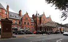 A estação foi projetada por Henry William Braddock, engenheiro civil do GCR.[14] Tem um design modesto devido à falta de dinheiro do GCR.[16] A sala principal de reservas tem 63 ft (19.2 m) por 40 ft 6 in (12.3 m).[17] É uma versão doméstica do estilo revival "Wrenaissance" que se encaixa no ambiente residencial com empenas holandesas, empregando tijolos quentes e pedras de cor creme.[17] A crista GCR foi trabalhada nas grades de ferro forjado em vários lugares.[16]