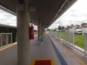 Estação de Superfície, com bilheterias ao nível do solo, rampa de acesso para pessoas portadoras deficiência e sistemas de sonorização. Com estrutura semelhante às demais estações, a plataforma de embarque e desembarque da estação em ilha, no entanto, possui seu mobiliário todo localizado em seu eixo, garantindo um bom deslocamento por parte dos usuários nas duas extremidades da plataforma. Guarda-corpos também foram localizados nas extremidades da plataforma para garantir mais segurança, liberando apenas a área direta de embarque e desembarque.[4]