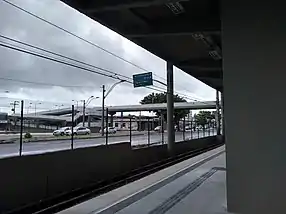 Estação de Superfície, com plataforma central, e estruturas em concreto aparente, além de possuir elevador para pessoas portadoras de deficiência.