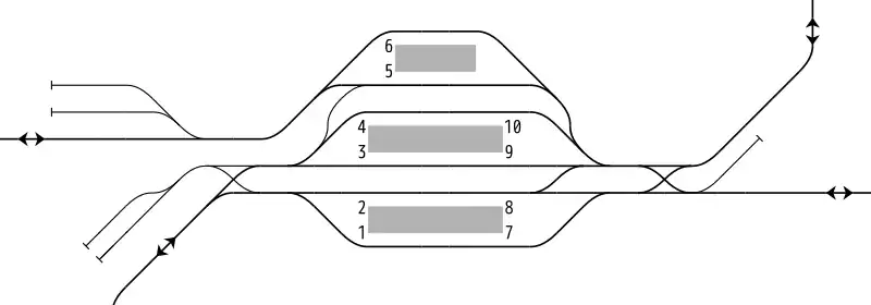Uma estação elevada com 3 plataformas de ilha e 6 linhas. As faixas 1 a 4 e 7 a 10 compartilham a mesma faixa.[3]