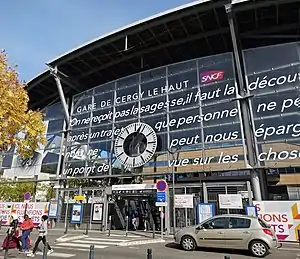 É uma estação de vidro com um relógio plano na frente de um edifício de escritórios. Dá acesso à Place des Trois Gares e ao centro de Cergy-le-Haut. As paredes do subsolo das plataformas são decoradas com placas de vitral azul/branco/vermelho que lembram várias cidades do mundo (Nova York, Angkor, Moscou, etc.) e portanto de viagens.