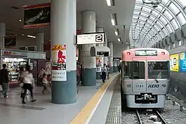 A Linha Keiō Inokashira termina na estação de Shibuya. A plataforma está diretamente conectada à Linha Yamanote da JR por um corredor com paredes de vidro que permitem que você veja o cruzamento de Shibuya lá fora.[16]