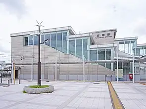 Uma estação acima do solo com uma única plataforma 1 lado 1 linha e uma plataforma ilha 1 lado 2 linhas, um total de 2 lados 3 linhas e um edifício de estação de ponte.