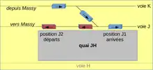 - alongando de 20 metros a fim de acomodar dois trens de trem-tram em ambas as posições J1 (a oeste, pela descida na chegada) e J2 (a leste pela subida na partida);