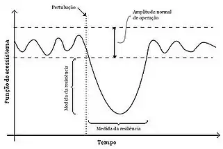 O conceito de resiliência diz respeito ao tempo necessário para que as variáveis retornem ao seu equilíbrio após passar por uma perturbação. Segundo Folke (2004), a resiliência do ecossistema se refere ao limite da perturbação que um sistema pode suportar, de modo a reter essencialmente a mesma função, estrutura, identidade e realimentação, antes de se transformar em um estado diferente [8], como demonstrado no gráfico abaixo, no qual, após uma perturbação, houve o decaimento da função do ecossistema em relação ao tempo. O ecossistema possui estados de estabilidade e estados de resiliência. Durante os estados de estabilidade, ocorre um aumento na organização e interação entre os elementos bióticos. Quando ocorre um distúrbio, o estado de estabilidade é substituído pelo estado de resiliência. Neste estado, o ecossistema passa por uma fase de reorganização dos elementos bióticos, gerando o estabelecimento de novas e diferentes interações. Caso o ecossistema não possua resiliência suficiente para adaptar-se e persistir ao distúrbio sofrido, ele pode atingir um novo domínio de estabilidade, menos rico em biodiversidade [9].