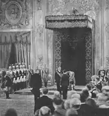| aAimone, Duque de Spoleto, aceitou a nomeação em 18 de maio de 1941, abdicou em 31 de julho de 1943 e renunciou a todas as reivindicações em 12 de outubro de 1943.[3][4][5] Posteriormente, o estado deixou de ser uma monarquia técnica. Ante Pavelić tornou-se chefe de estado, e seu título como líder do movimento governante Ustaše, "Poglavnik", tornou-se oficialmente o título de chefe de estado do NDH. | |||||