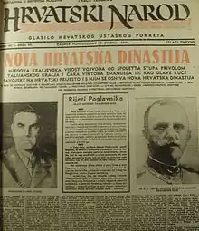 Em 10 de abril de 1941, o exército alemão assumiu o controle de Zagreb. Com o seu apoio, o tenente-coronel reformado Slavko Kvaternik, vice-líder dos Ustaše, declarou a criação do Estado Independente da Croácia (Nezavisna Država Hrvatska – NDH) "em nome dos croatas e do poglavnik Ante Pavelić".[46] Poucos dias depois, em 15 de abril de 1941, Ante Pavelić regressou a Zagreb do exílio na Itália e, em 16 de abril de 1941, assumiu o poder como Líder do Estado, ou "Chefe" (Poglavnik), ocupando o cargo de primeiro-ministro.[47]