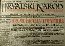 O estado era oficialmente uma monarquia após a assinatura das Leis da Coroa de Zvonimir em 15 de maio de 1941.[17][18] Nomeado por Vítor Emanuel III da Itália, o Príncipe Aimone, Duque de Aosta inicialmente recusou-se a assumir a coroa em oposição à anexação italiana da região povoada de maioria croata da Dalmácia, anexada como parte da agenda irredentista italiana de criação de um Mare Nostrum ( "Nosso Mar"). [19] Mais tarde, ele aceitou brevemente o trono devido à pressão de Vítor Emanuel III e foi intitulado Tomislav II da Croácia, mas nunca se mudou da Itália para residir na Croácia.