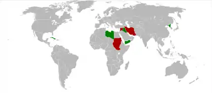 - Síria - "forneceu ao Hamas, Frente Popular para a Libertação da Palestina, Jihad Islâmica[3] e outras organizações terroristas asilo e privilégios para instalarem-se".[1]